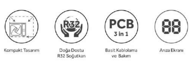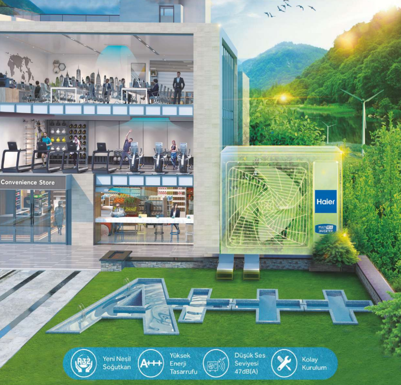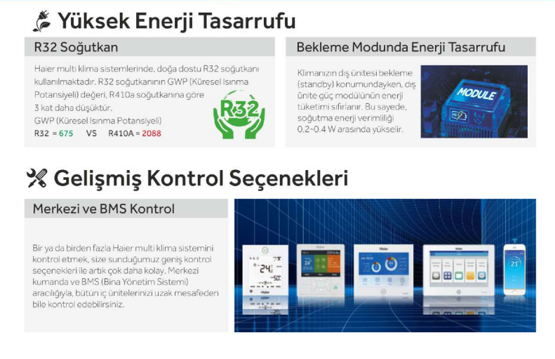 Doğa Dostu R32 Soğutkan: Haier sistemlerinde R32 soğutkanı kullanılmaktadır. R32'nin küresel ısınma potansiyeli (GWP), R410A'ya göre 3 kat daha düşüktür.