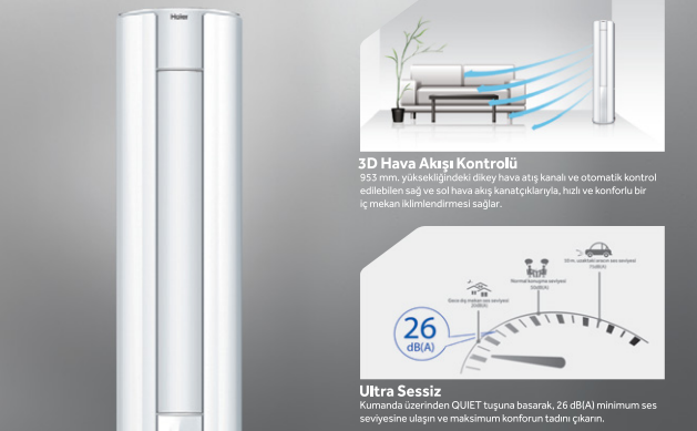 3D Hava Akışı Kontrolü: Hem yatay hem de dikey kanatçıkların otomatik kontrolü sayesinde hava, mekanın her köşesine eşit ve güçlü bir şekilde iletilir.