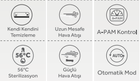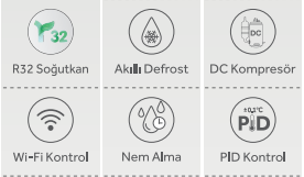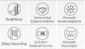 Turbo Soğutma | Blue Fin | Uyku Modu DC Motor | R32 Soğutkan | Akıllı Defrost DC Kompresör | Wi-Fi Kontrol | Nem Alma PID Kontrol | Kendi Kendini Temizleme | Uzun Mesafe Hava Atışı A-PAM Kontrol | 56°C Sterilizasyon | Güçlü Hava Atışı Otomatik Mod | Dual Nano | Geniş Voltaj Çalışma Aralıkları Otomatik Yeniden Başlatma | Dikey Hava Atışı | İç Ünite 5 Kademeli Fan Hızı Otomatik Arıza Teşhis | 3D Hava Atışı | Dış Ünite 7 Kademeli Fan Hızı Dijital Gösterge