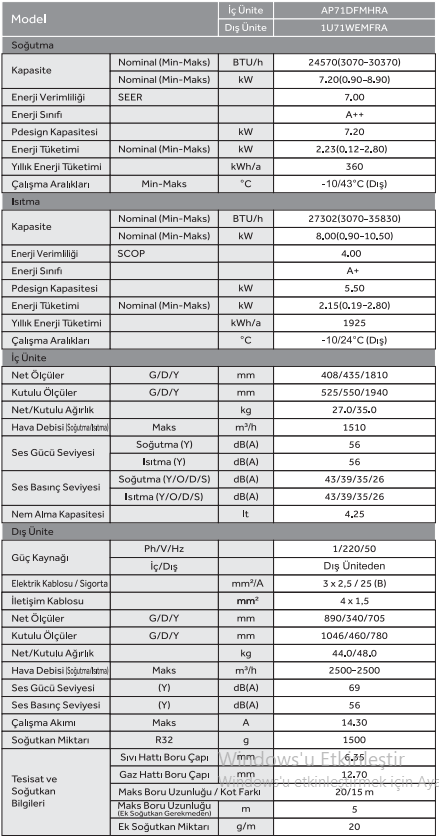 Dayanıklı Tasarım: Dış ünite 7 kademeli fan hızı ve DC kompresör teknolojisi ile farklı hava şartlarında stabil çalışma sağlar.